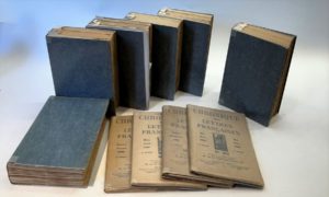 CHRONIQUE DES LETTRES FRANÇAISES Tome I : n° 1, janvier-février 1923-n° 6, novembre-décembre 1923 ; Tome II : n° 7, janvier-février 1924-n° 12, novembre-décembre 1924 ; Tome III : n° 13, janvier-février 1925-n° 18, novembre-décembre 1925 ; Tome IV : n° 19, janvier-février 1926-n° 23 / 24, septembre-décembre 1926 ; Tome V : n° 25, janvier-février 1927-n° 29 / 30, septembre-décembre 1927 ; Tome VI : n° 31, janvier-février 1928-n° 36, novembre-décembre 1928 ; Tome VII : n° 37-n° 40 / 42, juillet-décembre 1929. Paris, H. Floury, Éditeur, puis Édouard Champion Lyon, Henri Lardanchet, Éditeur, Directeur : Joseph Place, Comité de patronage : Maurice Barrès, Edmond Jaloux, Maurice Maeterlinck, Charles Maurras, Pierre de Nolhac. Textes de Claude Aveline, Edmond Estève, Valery Larbaud, Édouard Maynial, Joseph Place, Henri Pourrat, Jacques Rivière, Saint-Hilaire, Paul Valéry, etc. Collection complète en 42 numéros : 36 numéros en 34 livraisons en 6 vol. in-8 brochés + 6 numéros en 4 livraisons in-8 brochées. Joint : – Plusieurs lettres des Horizons de France, de l’Imprimerie G. de Bussac et de M. Place (1964-1965) concernant la revue et les numéros que A. Vasseur recherchait. La collection constitue un instrument de documentation et de travail d’une grande valeur. Les n° 38 à 42 sont rares (une grande partie de ces numéros ont été égarés à Vichy pendant la guerre). Les volumes sont reliés sous brochures d’éditeur.