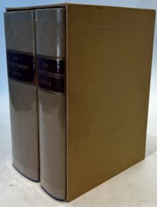 LE NAVIRE D’ARGENT Revue mensuelle de littérature et de culture générale N° 1, 1er juin 1925-n° 12, 1er mai 1926. Paris, À La Maison des Amis des Livres, Directrice : Adrienne Monnier, Secrétaire de la rédaction : Jean Prévost. Textes de Marcel Arland, Sylvia Beach, William Blake, Blaise Cendrars, Paul Claudel, E.E. Cummings, Joseph Delteil, John Donne, T.S. Eliot, Jean Giraudoux, Ramón Gómez de la Serna, Franz Hellens, Ernest Hemingway, James Joyce, Valery Larbaud, François Mauriac, Adrienne Monnier, Jean Prévost, Alfonso Reyes, Jacques Rivière, Jules Supervielle, Italo Svevo, William Carlos Williams, etc. Collection complète. 12 numéros en 12 livraisons en 2 vol. in-8 reliés (couvertures conservées) sous emboîtage. Notes manuscrites de Vasseur (4 ff.). Joint : – 1 L.A.S. d’Adrienne Monnier (2 juin 1926) à la Vicomtesse de Lacroix Laval, entièrement consacrée au Navire d’argent ; – Des billets autographes ou dactylographiés adressés à Édouard Dujardin de : Paul Valéry (1925), Valery Larbaud (23 novembre 1931), André Chamson (1930) ; – 1 note manuscrite sur papier à en-tête de Shakespeare and Company donnant l’adresse parisienne de James Joyce (janvier 1932) ; – 1 L.A.S. à en-tête de La Maison des livres annonçant la sortie de l’ouvrage d’Adrienne Monnier : Les Gazettes d’Adrienne Monnier (décembre 1953) ; – 1 carte d’invitation pour la séance consacrée à James Joyce adressée à M. et Mme Édouard Dujardin (26 mars 1931) ; – Portraits de : Valery Larbaud, Saint-Exupéry, Paul Valéry, André Gide, Paul Claudel, François Mauriac, Jules Romains, Henry de Montherlant, Joseph Kessel, Georges Duhamel.
