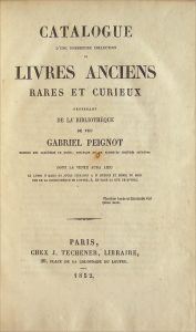 [Bibliographie]. Peignot. Catalogue d’une Nom- breuse Collection de Livres Anciens Rares et Curieux ... dont la vente aura lieu le lundi 8 mars et jours suivants ... Techener, 1852. In-8, cartonnage papier noir, titre doré au dos. Faux-titre,...