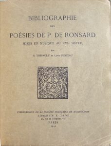 1969. In-8, reliure éditeur, titre doré au dos. xi-142 pp. et 1 f. (table). Ex-libris (cachet à froid) sur le faux-titre. Reprint de l'édition de 1911. • CHAMPION (Pierre). Ronsard et son Temps. Avec 24 photo- typies hors texte. Paris, Édouard Champion, 1925. Grand in-8, reliure toile rouge, pièce de titre basane rouge. Couvertures conservées. xviii-508 pp. et 24 planches hors texte. Bel état. Édition sur vergé avec un extrait manuscrit du texte signé des initiales de l'auteur et numéroté 17/50 (bien qu'aucun grand papier ne soit annoncé). • THIBAULT (G.) et PERCEAU (Louis). Bibliographie des Poé- sies de P. de Ronsard mises en musique au XVIe s. Paris, Droz, 1941. Grand in-8, reliure demi-basane verte, dos à 5 nerfs. Dos insolé. Cou- vertures et dos conservés. 117-(5)-15-(2) pp. Annotations au crayon.
