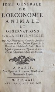 Helvetius (Jean-Claude-Adrien). Idée Générale de l'Oeconomie animale et Observations sur la petite Vérole. Paris, Rigaud, 1722. Lettres à M*** au sujet de la Lettre critique de M. Besse Contre l'Idée Générale de l'Oeconomie animale et les...