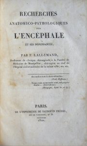 Lallemand (Claude François). Recherches Anatomico- Pathologiques sur l'Encéphale et ses dépendances. Paris, Bau- douin,1820 (pour le t. 1), Béchet jeune, 1823 et 1834 (pour les t. 2 et 3). 3 volumes in-8, reliure de l'époque demi-basane olive,...