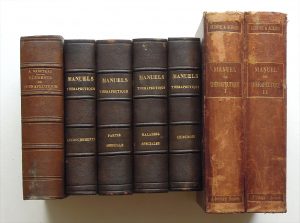 édition revue, corrigée et aug-mentée (1901).788 pp.; Accouchements et Maladies des femmes en couche par L. Gaulard et V. Bué (1901). 602 pp.; Thérapeutique chirurgicale et Chirurgie journalière, par G. Phocas (1901). 788 pp.; Maladies Spéciales : Yeux par S. Baudry, Nez par A. Malherbe, Bouche et dents par G. Béal, Peau par C. Barbe (1902). 710 pp. • DEBOVE (G.-M.), ACHARD (Ch.). Manuel de Thérapeu- tique Médicale. Paris, Rueff, 1900-1901. 2 volumes in-8, reliure éditeur demi-basane grenat, dos lisse (épider- mures). T. 1 : (6)-653 pp. T. 2 : (4)-687 pp. Rousseurs. Figures in texte. • RABUTEAU (A). Eléments de Thérapeutique et de Phar- macologie. 2e édition revue et augmentée. Paris, Lauwereyns, 1875. In-8, reliure demi-chagrin brun, dos à 4 nerfs souligné de filets dorés. Dos un peu taché, minimes accrocs. viii-1173 pp. Qq. rousseurs notam- ment sur les premiers et derniers ff.