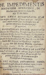 Ponce de Santa Cruz (Antonio). De Impedimentis magnorum auxiliorum, in morborum curatione lib. III ad tyrones... Barcelona, per Antonio de la Cavalleria, a costa de Diego Martin Vellaz librero, 1674. In-12, reliure XVIII.s. basane brun marbré, dos...