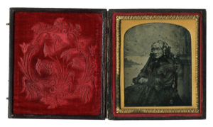 Ambrotipo in cornice dorata con cofanetto originale in pelle e fermagli conservati. All'interno velluto rosso protettivo con impressioni floreali. Dimensioni: 93x83 mm. (1)