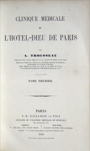 Trousseau (Armand). Clinique Médicale de l’Hotel- Dieu de Paris. Paris, Baillière, 1861-1862. 2 volumes in-8, reliure demi-basane fauve, dos lisse orné. Qq. épider- mures, notamment le long des mors, petites déchirures aux coiffes. lii-772...