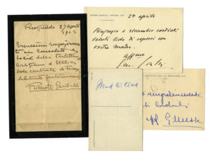 Raccolta di 28 tra lettere, biglietti, cartoline e biglietti da visita autografi o con firme autografe di politici, scrittori e artisti. XIX-XX secolo.