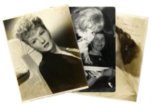 Dediche e firme a inchiostro blu, nero e giallo. Al verso delle fotografie (anche tratte da film) alcune didascalie esplicative in italiano, tedesco o inglese (manoscritte o dattiloscritte). Talvolta il timbro del fotografo: Metro Goldwin Mayer, Foto UFA, Warner Bross first National Films, Whitey Schafer. Nel lotto anche 4 riproduzioni di fotografie (Marilyn Monroe e Sophia Loren). Dimensioni 260x200 circa (19)