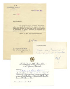 Manoscritti a inchiostro blu e nero. Lettere autografe o dattiloscritte con firme autografe. Alcune buste conservate. Tra i documenti anche un invito, da parte del Presidente della Repubblica Gronchi - per il ricevimento in Quirinale in onore del Presidente della Repubblica Turca (conservato anche il contrassegno per entrare dal portone di Piazza del Quirinale). Dimensioni varie. (10)