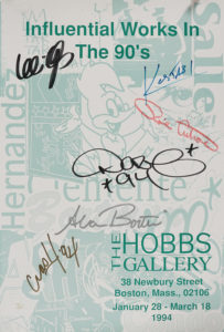 Poster originale della mostra collettiva del '94: "Influential works in the 90's", con firme autografe di sei artisti; numerato 39/125. Perfetto stato. Dimensioni 410x610 mm. (1)
