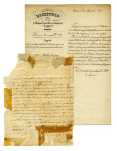 Manoscritti a inchiostro nero. Su carte intestate. Un taglio al documento datato 5 febbraio 1851, ma senza perdita di testo (questo documento è stato conservato a stretto contato con una carta moderna e una pagina del documento del 1851 ne ha assorbito parte del testo). Dimensioni varie. (11)
