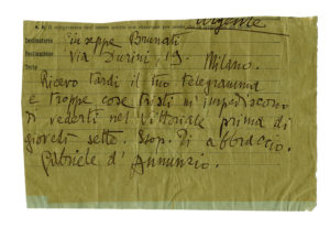 D'Annunzio Gabriele, Telegramma autografo firmato inviato allo scrittore Giuseppe Brunati, Via Durini 19 Milano. Non datato.