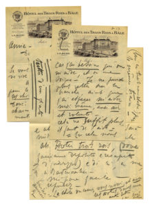 Prima lettera: manoscritto a matita nera, in francese. 3 bifoli intestati Hôtel des Trois Rois à Bâle (Basilea) con veduta dell'albergo, datato Bâle, 24 luglio, senza l'anno. 12 pagine, scritte di getto nel tipico stile della Duse, in orizzontale e in verticale, con tante sottolineature e sigla "ed". Dimensioni 145x220 mm. Seconda lettera: manoscritto a inchiostro viola. 1 bifolio, datato 6 ottobre, senza l'anno. Scritta una pagina, con firma. Dimensioni 130x205 mm. (2)