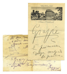 Prima lettera: manoscritto a inchiostro viola. 1 biglietto cartaceo, scritto fronte retro, firmato. Dimensioni 215x135 mm. Seconda lettera: manoscritto a matita nera. 1 bifolio intestato Eden Hôtel Rome con veduta dell'albergo, senza data. 3 pagine, scritte in orizzontale e in verticale. Dimensioni 135x210 mm. Terza lettera: manoscritto a matita nera. 1 modulo stampato per telegrammi dell'Hotel Eden, scritto al verso. Dimensioni 190x265 mm. (3)