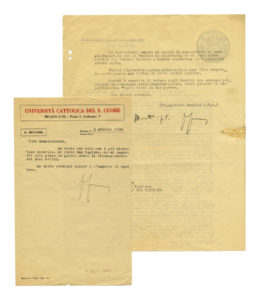 Dattiloscritti e firme a inchiostro nero. 2 carte, scritte 3 pagine. Lettera su carte con intestazione "Università Cattolica del S. Cuore Milano [...] Piazza S. Ambrogio, 9" e "Universitas Catholica / Sacri Cordi Jesu / Mediolani". Dimensioni varie. SI AGGIUNGE: Pio XI (papa). Firma autografa su foglio con dedica e ritratto fotografico. Non datato. (3)