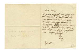Manoscritto a inchiostro nero. 1 bifolio, scritta 1 pagina. Su carta con timbro a secco "Vellum". Dimensioni: 113x90 mm. (1)