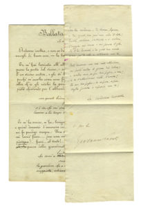 Manoscritto a inchiostro nero. 1 carta scritta al recto. Insieme anche un foglio dattiloscritto relativo a questo testo poetico. Dimensioni: 105x320 mm. SI AGGIUNGE: 1 componimento poetico manoscritto con alcune correzioni dal titolo "Ballata". Non datato. (3)