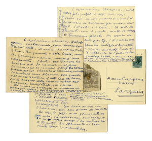 Manoscritti a inchiostro nero e blu e matita grigia. Nel lotto anche 6 cartoline e lettere di altri autori inviate a Carpena. Dimensioni varie. (225)
