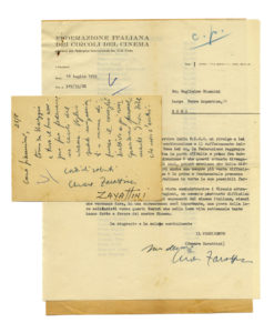 Zavattini Cesare, 2 lettere dattiloscritte con firme autografe e 1 biglietto autografo firmato. Datate anni '50 del XX secolo.