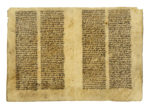 Manoscritti pergamenacei a inchiostro marrone scuro, azzurro e rosso. Testi in latino. Scrittura tarda carolina, cancelleresca, gotica (italiana e tedesca). Alcuni fogli sono stati anticamente recuperati da legature. Sono presenti difetti: alcuni brevi strappi, talvolta alcune mancanze e scoloritura dell'inchiostro (soprattutto al verso del foglio). Dimensioni varie. (10)
