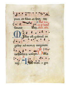 Manoscritti a inchiostro nero e rosso. 6 fogli (scritti recto e verso). Notazione musicale su tetragramma. 18 capilettera decorati a inchiostro blu e rosso. Scrittura gotica. Fogli provenienti da antifonario. Dimensioni: 530x400 mm. (6)