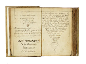 Manoscritto cartaceo a inchiostro bruno. Carte 260 scritte, 53 bianche (o marmorizzate). Testo in francese con moltissimi disegni in b/n e a colori (78 a piena pagina, 23 più piccoli e 3 tavole ripiegate). Angoli inferiori delle prime carte lievemente consumati non inficiano il testo; per il resto, stato di conservazione molto buono. Legatura non coeva, rigida, in piena pergamena. Dimensioni 150 x 110 mm. (1)