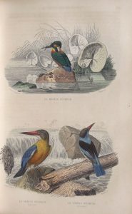 à 4 larges nerfs orné. Texte sur deux colonnes. Rousseurs, papier des planches souvent bruni. Ex- libris (cachet) portant la devise Non Renuo Ardua (famille Renouard de Bussière). T. 1 : Portrait en frontispice, 2 ff., 782 pp., 5 cartes hors texte. T. 2 (Théorie de la Terre - Minéraux) : 2 ff., 782 pp. T. 3 (Mammifères - I) : 2 ff., 726 pp. et 13 pl. hors texte. T. 4 (Mammifères - II) : 2 ff., 784 pp. et 29 pl. hors texte. T. 5 (Oiseaux - I) : 2 ff., 653 pp. et 44 pl. hors texte. T. 6 (Oiseaux - II) : 2 ff., 732 pp. et 30 pl. hors texte. Soit 116 pl. en couleurs.