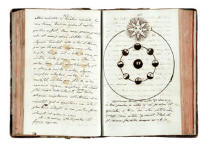 Manoscritto cartaceo a inchiostro nero. Tagli rossi. Carte lievemente azzurrine in ottimo stato. Pagine [4], 459, [5]. Testo in latino corsivo con alcune figure astronomiche dei pianeti e del sistema solare. Conservati sciolti nel volume alcuni disegni geometrici ed una piccola tavola sui moti della luna. Legatura coeva in mezza pelle con dorso a nervi e carta marmorizzata (con difetti). Ex libris And. Le Glay. Dimensioni 190 x 125 mm. (1)