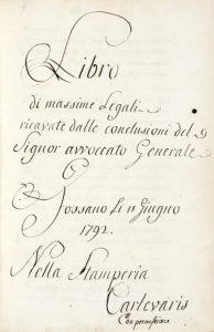 Libro / di massime Legali / ricavate dalle conclusioni del / Signor avvocato Generale / G / Fossano Li 15 Giugno / 1792 / Nella Stamperia Carlevaris [...]..