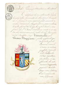 Raccolta di carte relative alla famiglia Toscanelli, già Toscani Baggiani (con stemmi acquarellati). XIX secolo.