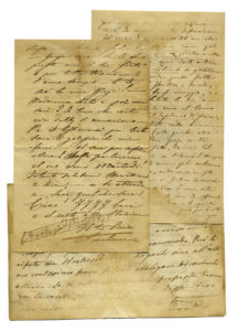 Manoscritti a inchiostro nero. 12 pagine scritte in totale (1 pagina scritta da altra mano). 2 buste conservate. 2 lettere con tracce di umidità e, a tratti, parziale perdita di testo. 1 lettera con una citazione musicale. Dimensioni varie. (3)