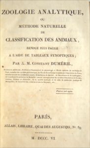 Duméril (Constant). Zoologie Analytique, ou Méthode naturelle de Classification des Animaux, rendue plus facile à l'aide de Tableaux synoptiques. Paris, Allais, 1806. In-8, reliure de l'époque demi-basane brun foncé à petits coins de vélin,...