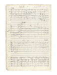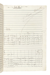 Manoscritto a inchiostro nero, rosso e matita grigia su carta pentagrammata. Organico orchestrale: Piccolo, Flauti, Oboi, Clarinetti in La, Fagotti, Corni in Fa, Trombe in Fa, Tromboni, Basso Tuba in Fa, Timpani, Arpa, Violino I-II, Viola, Cello, Basso. Composizione scritta su tre fascicoli (più volte firmati). Pagine dei tre fascicoli: 83, 64, 81. Alcune correzioni e cancellature nel testo. Dimensioni: 405x310 mm (fascicolo I e II) - 480x340 mm (fascicolo III). (1)