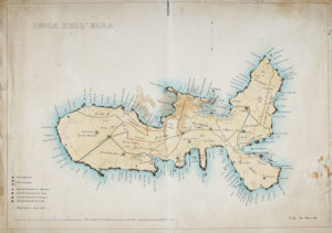 Penna e bistro, pennello e acquerello a colori grigio, azzurro, marrone, verde, giallo e rosa. Carta spessa non vergellata color avorio "J WHATMAN / TURKEY MILL". mm 544x765. Carta geo-topografica, disegnata a mano con inchiostro di china, entro riquadro a filetto. In alto il titolo, in basso a sinistra i simboli dei "Posti Soppressi/Posti Presidiati/Posti del Circondario di Marciana / Posti del Circondario di Campo / Posti del Circondario di Longone / Posti del Circondario di Rio" e più in basso l'indicazione di luogo con la data "Portoferraio, Agosto 1860" e la scala in miglia; nell'angolo in basso a destra la firma del cartografo "Il Cap: Scip: Mazzei Dis:". La mappa, riporta il perimetro costiero a inchiostro bruno con gran numero di toponimi di porti, spiagge, capi, punte, golfi, cale, e località, il perimetro è contornato da un'ampia banda azzurra all'acquerello. L'isola è divisa in vari territori da linee di diverso colore, paesi e abitazioni sparse colorate in rosa, in evidenza le fortezze di Longone e Portoferraio, i monti e le strade principali. (1)