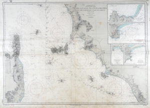 Litografia. mm 765x1115. Col numero "3939" ai quattro angoli, racchiusa entro due riquadri di cui quello più interno con le graduazioni, in mare numerose indicazioni per le profondità marine e cinque grandi bussole disegnate in color viola. Vi è raffigurata la costa, bordata d'azzurro, da Capo Cavallo a Civitavecchia (più esattamente da Punta Castiglioncello a Santa Marinella), con parte della Corsica a sinistra e le isole dell'arcipelago toscano al centro, con l'Elba in bella evidenza; in alto a destra, in quattro riquadri a parte, vi sono i particolari di Porto Santo Stefano, Porto Vecchio di Piombino, Baia di Talamone e Porto Ercole. (1)