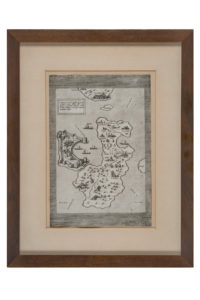 Incisione in rame. mm 304x202. Tavola senza indicazioni di responsabilità, incorniciata da grande bordo a tratteggio orizzontale. Titolo entro cartiglio rettangolare in alto a sinistra. Non sono presenti graduazioni ai margini né scale. Mappa orientata con il nord-est in alto e indicazione dei punti cardinali negli angoli; sulla sinistra spicca la sproporzionata grandezza di Cosmopoli (l'attuale Portoferraio, fondata da Cosimo I de' Medici nel 1548), cinta di possenti mura, protetta dal forte Stella e unita al resto dell'isola da un ponticello, con tre imbarcazioni in rada. Orografia a ondulazioni variamente ombreggiate, radi i boschi, paesi raffigurati con case e chiese. Nella parte nord-est l'indicazione "Caue de uena de ferro", soltanto abbozzata la parte nord-occidentale dell'isola, dove figurano solo due località: Marciano (sic) e S. Andrea. Il mare è reso a piccolissimi trattini, a lambire parte della costa toscana, con Populonia, Piombino, l'isola di Palmaiola e una porzione di Pianosa. Si veda per confronto altro esemplare con cornice a tratteggio presso Bibliothèque nationale de France (Inv. GE CC-1380 / https://gallica.bnf.fr/ark:/12148/btv1b55000160j). (1)