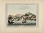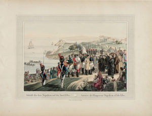 Acquaforte e acquatinta a colori. mm 415x520. Foglio: mm 473x643. Coppia di incisioni senza indicazione di responsabilità e datazione. Raffigurano rispettivamente l'arrivo di Napoleone all'isola d'Elba (4 maggio 1814) e la fuga (26 febbraio 1815). Nella prima il sindaco di Portoferraio Traditi consegna a Napoleone le chiavi della città, alla presenza di una folla di soldati in alta uniforme, cittadini, religiosi, e un corteo di popolani e curiosi; sullo sfondo la città e sulla sinistra il mare con barche e velieri. Nella seconda si osserva in primo piano il mare con due grossi velieri (uno dei quali è l'Incostant), al centro una parte della città sovrastata dal Forte Falcone e sullo sfondo a sinistra le montagne elbane dominate dal Monte Capanne. (2)