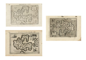 Incisione in rame. mm 87x125. Foglio: mm 110x170. Da Tabulae Geographicae Contractae, Amsterdam, Jodocus Hondius Jr., 1616. In alto, fuori dal rame, si legge il numero di pagina "416" e il titolo Descriptio Ilvae. Breve testo latino al verso. SI AGGIUNGONO: Id., ELBA. Incisione in rame. mm 87x125. Foglio: mm 121x175. Da La Geographie Racourcie de Pierre Bertius. Amsterdam, Jodocus Hondius jr. 1618, edizione francese di Tabulae Geographicae Contractae. / Anonimo del XVII secolo. Description d'Ilve/ELBA. Incisione in rame. mm 95x137. Foglio: mm 125x185. Da piccolo atlante tascabile francese. Al verso parte finale della "Description de Corsique". Nell'angolo in alto a sinistra un vascello e in quello in basso a destra un mostro marino. Carta geo-topografica con ampia ombreggiatura lungo tutto il perimetro dell'isola e del tratto di costa toscana, ma sostanzialmente uguale alle due precedentemente descritte. (3)