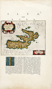 Incisione in rame in coloritura. mm 200x260. Foglio: mm 525x310. Dal terzo volume di Theatrum Orbis Terrarum sive Atlas novus. Testo latino. In alto a sinistra cartiglio per il titolo e in basso a destra altro per la "Scala di miglia quattro". In alto nella pagina l'iscrizione "ILVA,/ hodiè/ ELBA." e sotto l'inciso il testo storico-descrittivo in latino, con bella iniziale ornata e colorata e sulla pagina successiva fleuron anch'esso colorato. Presenti gli isolotti e gli scogli intorno l'isola, numerosi i toponimi. (1)