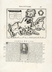 Incisione in rame. mm 195x262. Foglio: mm 495x357. Dal I volume dell'Isolario, Descrittione geografico-historica, sacro-profana, antico-moderna, politica, naturale, e poetica [...] di tutte l'isole... Venetia, 1696. Carta geo-topografica, con cartiglio per il titolo in alto a sinistra e stemma muto a destra, assai simile nella forma a quella incisa da Floriano dal Buono, probabilmente a Bologna intorno al 1646, con pochi toponimi, ma con marcati rilievi orografici. Sono ben evidenziate le fortezze di "Cosmopoli, o Porto Ferraio" e "Porto Longone" e, nella parte occidentale, la "Fonte", la nota sorgente ricordata dagli storici elbani, che curiosamente fornisce molta più acqua d'estate che d'inverno, generando una specie di laghetto che alimenta l'emissario Marciana che va a sfociare nell'odierna baia di Marciana Marina. Nella metà inferiore del foglio si legge il testo storico-descrittivo dell'Elba che include il ritratto inciso in ovale di Federico Gualdo (o Gualdi), alchimista ed enigmatico personaggio, che si dichiarava d'origine germanica, mentre nelle ultime due righe del testo si legge "D'Elba è nativo il Gualdo, di cui esponiamo il ritratto per il motivo, che ne porge l'elogio sotto di lui posto". Al verso del foglio si trova la pianta incisa della "Città, e Fortezza di Livorno...", con sotto la descrizione delle "Isolette che sono in faccia al porto di Livorno". (1)