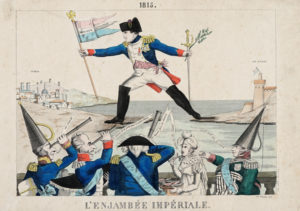 Xilografia a colori. mm 392x550. Foglio: mm 418x640. Dalle Battaglie Napoleoniche (Imagerie d'Epinal), serie di 22 xilografie a colori eseguite tra il 1830 e il 1840 da François Georgin (1801-1863), il cui nome si legge sulla matrice in basso a destra. Animatissima e coloratissima scena in cui si vede Napoleone Bonaparte, appena sbarcato nel Golfe Juan, vicino ad Antibes, con gli uomini della sua guardia, che viene trionfalmente accolto dalla popolazione del luogo. SI AGGIUNGE: Felix Fleury (disegnatore). L'Enjambée Impériale. 1867 ca. Litografia in coloritura. mm 215x270. Da caricatura originale opera di anonimo pubblicata nel 1815. Vi sono raffigurate le autorità parigine in allarme per il ritorno di Napoleone. (2)