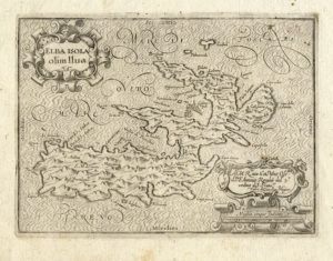 Incisione in rame. mm 171x231. Foglio: mm 245x390. Quarantacinquesima tavola da Italia di Gio: Ant. Magini. Data in luce da Fabio suo figliuolo..., Bologna 1620. In alto a sinistra il titolo entro elaborato cartiglio, in basso a destra la dedica entro cartiglio formato da due grifi e al di sotto scala miliare. Dettagliata carta geografica dell'Elba, la prima assai ben delineata e simile al reale nella forma, con gli isolotti vicini, golfi, insenature, capi, promontori, orografia, mare reso a brevi tratti, scritte in caratteri calligrafici, molti i toponimi dei centri abitati, tra cui spicca Cosmopoli e, nell'estrema parte nord-occidentale, l'indicazione ripetuta della località, all'epoca molto importante, di Sant'Andrea (Capo di S. Andrea, Porto di S. Andrea, S. Andrea). (1)