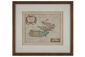 Incisione in rame in coloritura. mm 195x250. Foglio: mm 240x285. Da Nouveau theatre d'Italie, ou description exacte de ses villes, palais, Eglises, principaux edifices... pubblicato ad Amsterdam nel 1704/1705 e di nuovo nel 1724. La carta dell'Elba, compresi i due cartigli, è identica, a quella del Blaeu. (1)