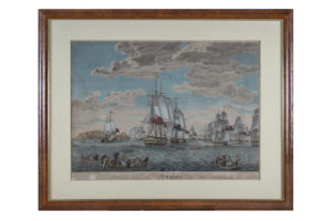 Incisione in rame, in coloritura. mm 520x710. Stampa storica che raffigura la partenza degli Inglesi da Portoferraio il 16 aprile 1797, in seguito agli accordi col Granduca di Toscana. In primo piano alcuni gozzi (quello a sinistra battente bandiera medicea), carichi di gentiluomini e dame, alcune con cappelli e ombrellini, che si dirigono verso i numerosi velieri in attesa a largo; sullo sfondo a sinistra veduta di Portoferraio parzialmente nascosta da un grosso veliero. (1)