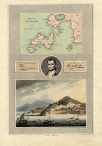 Bulino e acquatinta a colori. mm 415x298. Foglio: mm 478x325. Tavola da An Illustrated Record of Important Events in the Annals of Europe, During the Years 1812, 1813, 1814, & 1815. Comprising a Series of Views of Paris, Moscow, the Kremlin, Dresden, Berlin, the Battles of Leipsic, etc. etc. etc. Together with a History of Those Momentous Transactions, pubblicato da Robert Bowyer a Londra nel 1815. Nella parte alta, entro riquadro la mappa dell'Elba e il tratto di costa toscana antistante, nella parte bassa, ancora in riquadro, una bella veduta di Portoferraio con in primo piano il mare e alcune imbarcazioni; al centro del foglio un piccolo ritratto di Napoleone in medaglione tra due facsimile d'autografo. SI AGGIUNGE: VUE DE L'ISLE D'ELBE PORTO FERRAJIO. A Paris, chez Alex.dre Tessier, 1815 ca. Bulino. mm 225x302. Foglio: mm 294x410. (2)