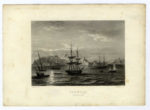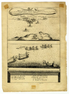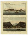 Acquaforte. mm 252x177. Foglio: mm 300x217. Tavola XXXVII tratta dall'opera di Fulvio Fontana, I pregi della Toscana nell'imprese più segnalate de Cavalieri di Santo Stefano, Firenze, Miccioni e Nestenus, 1701. La tavola raffigura una delle tante battaglie navali tra la flotta toscana e i Turchi che imperversavano nel Mediterraneo. Rame diviso in due parti: nella metà in alto vi è il titolo in cartiglio e la veduta della fortezza, nella parte bassa lo schieramento delle navi contraddistinte da lettere sciolte nella legenda. SI AGGIUNGONO: L'ILE D'ELBE (26 Février 1815). Sandoz del. Outhwaite sc. 1815. Incisione su acciaio. mm 115x145.Veduta di Portoferraio sullo sfondo, in rada alcune imbarcazioni con al centro il grosso veliero "Incostant" col quale Napoleone fuggirà dall'isola nel tardo pomeriggio del 26 febbraio 1815. / Ansicht von Porto-Ferrajo auf der Insul Elba / Ansicht von Jamestown auf der Insul S. Helena. 1815/1821. Incisione in rame in coloritura. mm 224x177. Vedute di Portoferraio e di Jamestown, i capoluoghi delle due isole ove fu esiliato Napoleone, impresse sullo stesso foglio. In alto le scritte "Verm. Gegenstaende. CCIII. - Melanget. CCIII.". (3)