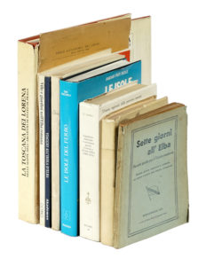 Compongono il lotto: 1) Saggini Sirio, Su e giù per la costa etrusca, i dintorni e l'Isola d'Elba. Notizie storiche e itinerari turistici. Pisa: Giardini, 1961; 2) Racheli Gin, Le isole del ferro. Natura, storia, arte, turismo dell'Arcipelago Toscano. Milano: Mursia, 1987; 3) Spadoni Ugo, Capitalismo industriale e movimento operaio a Livorno e all'isola d'Elba (1880-1913). Firenze: Olschki, 1979; 4) Squarcialupi Marcello, La guerra del 1552-56 in Maremma e nell'Elba contro i Turchi e i Francesi alleati. Diario. Firenze: Tip. Ducci, 1912; 5) Sette giorni all'Elba. Piccola guida per il Turista moderno. Seconda edizione aggiornata e aumentata, con cartina e quadro delle distanze chilometriche. A cura di Mario Bitossi e Leonida Foresi. Portoferraio: Tip. Popolare, 1952. Elenco completo disponibile su richiesta. (15)