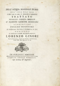 Buzzegoli Alberto Giuseppe, Dell'acqua marziale di Rio nell'isola dell'Elba e dell'uso di essa in medicina e chirurgia... In Firenze: appresso Andrea Bonducci, 1762.