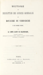 Davet de Beaurepaire (comte de) Davet de Beaurepaire (comte de), Histoire et description des sources minérales du Royaume de Sardaigne et des contrées voisines. Paris: Librairie de L. Maison, s.d. [i.e. 1852].