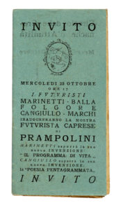 Casa d'Arte Bragaglia, Invito - mercoledì 25 ottobre ore 17 i futuristi Marinetti Balla Folgore Cangiullo Marchi inaugureranno la mostra futurista caprese di Prampolini. Roma, 15 ottobre 1922.
